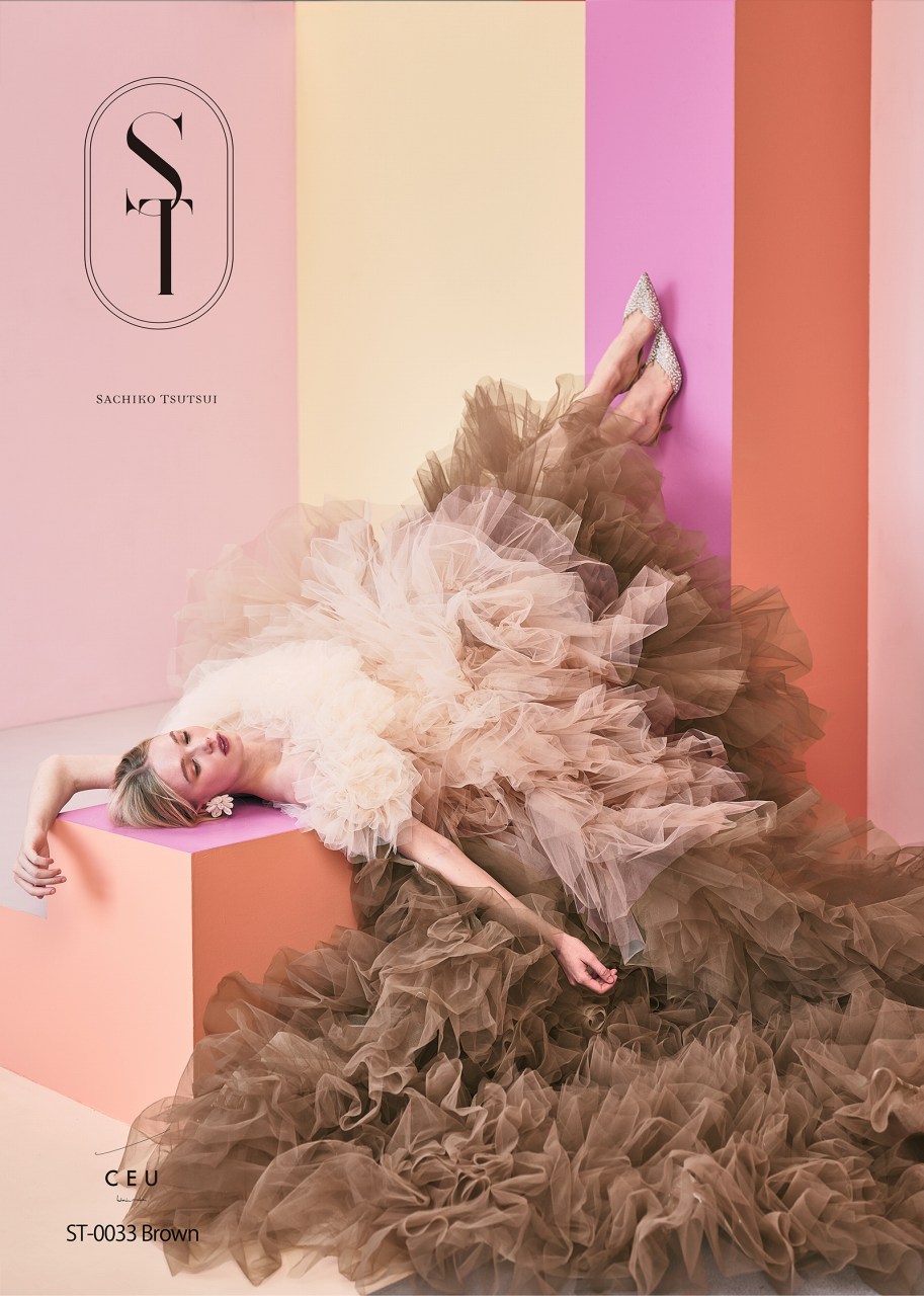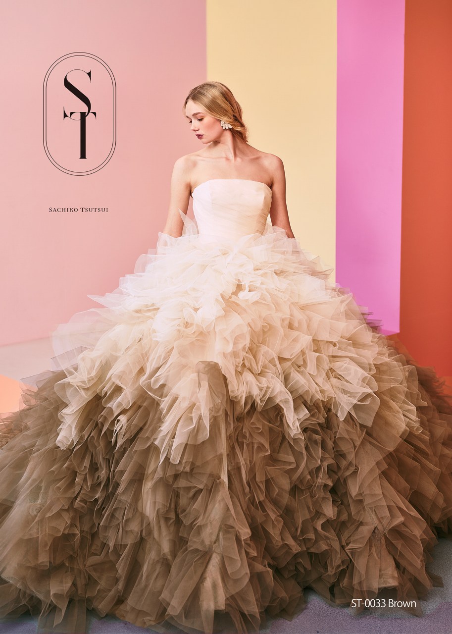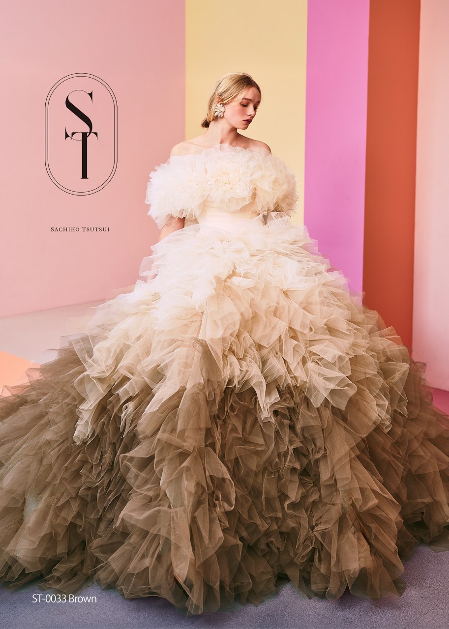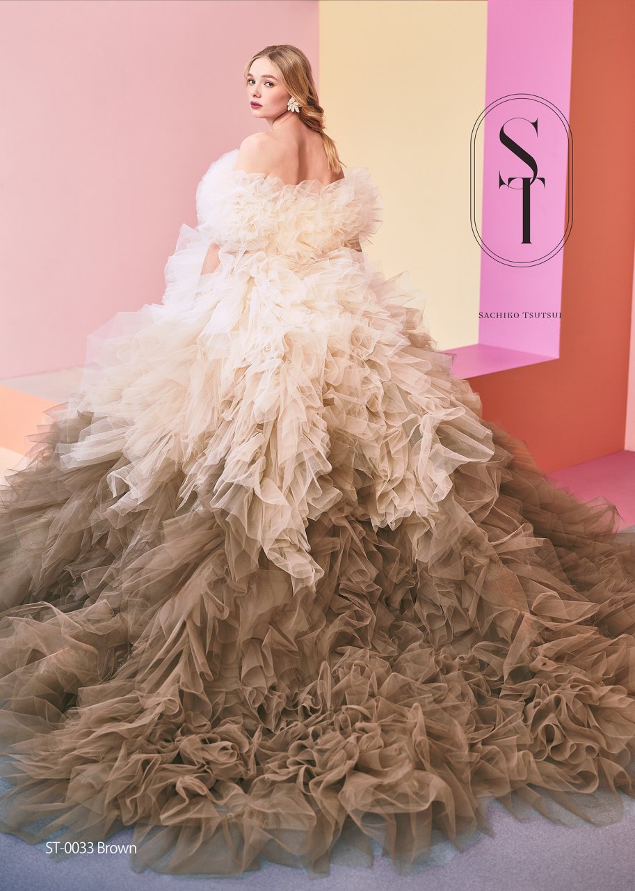 たっぷりなチュールフリルの贅沢なボリュームに包まれながらも、ニュアンスカラーにこだわったグラデーションが、ドレス全体に洗練された表情と奥行きをもたらします。